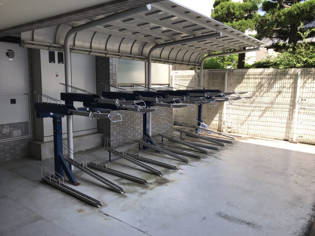 このタイプの駐輪ラックが設置されている場合、上げ下ろしの際に力が必要になる事、後ろカゴやイスが付いた自転車を下段に止めてしまうとカゴやイスにラックが接触してしまう事が悩みの種となる場合が多いです。