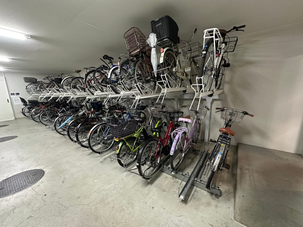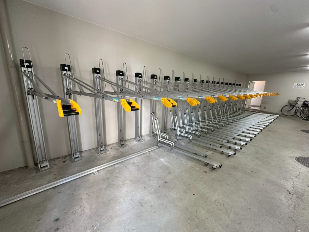 マンションの駐輪場は屋内の1箇所ですが、上段は引き出し式、下段はスライド式と少し珍しいタイプでの設置となっておりました。