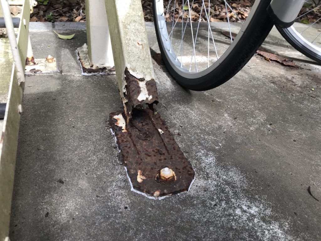 海が近いこともあり、潮風の影響や、一部に雨がたまってしまう事から錆が多く発生してしまっており、一部の下段ラックに関しましては使い物にならないとの事で取り外されてしまっていました。